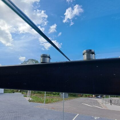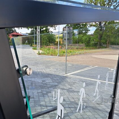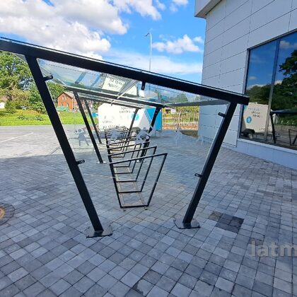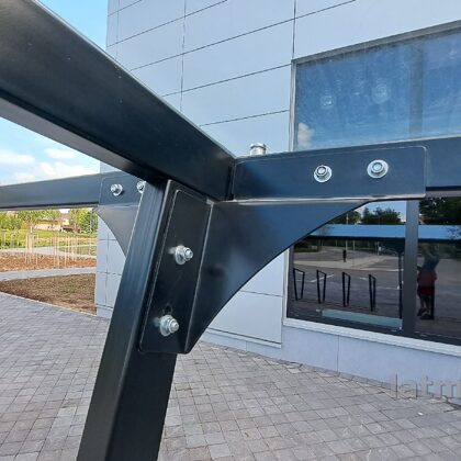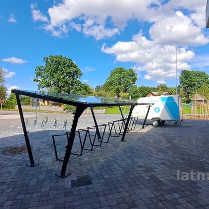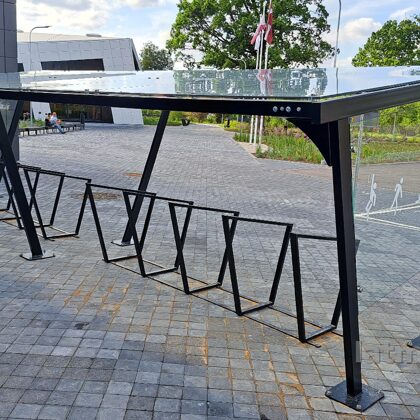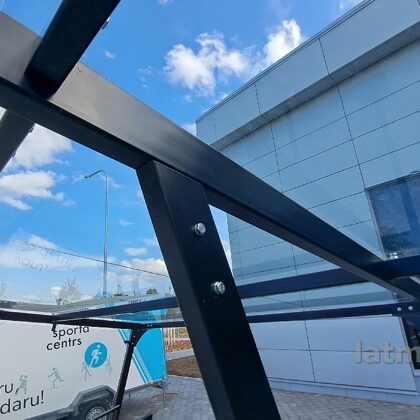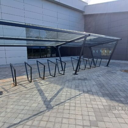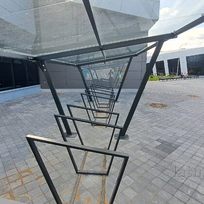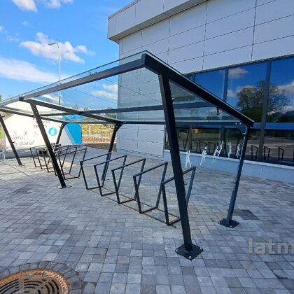 - Velo statīvi un velo nojume ar rūdīta stikla jumtu