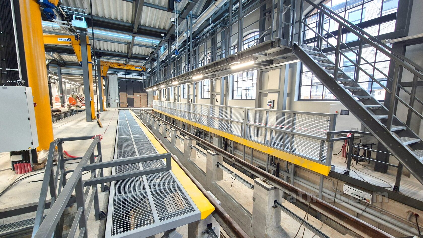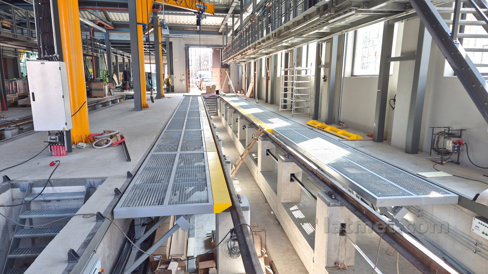 Tramvaja platformu vāku testēšana ražošanas cehā -